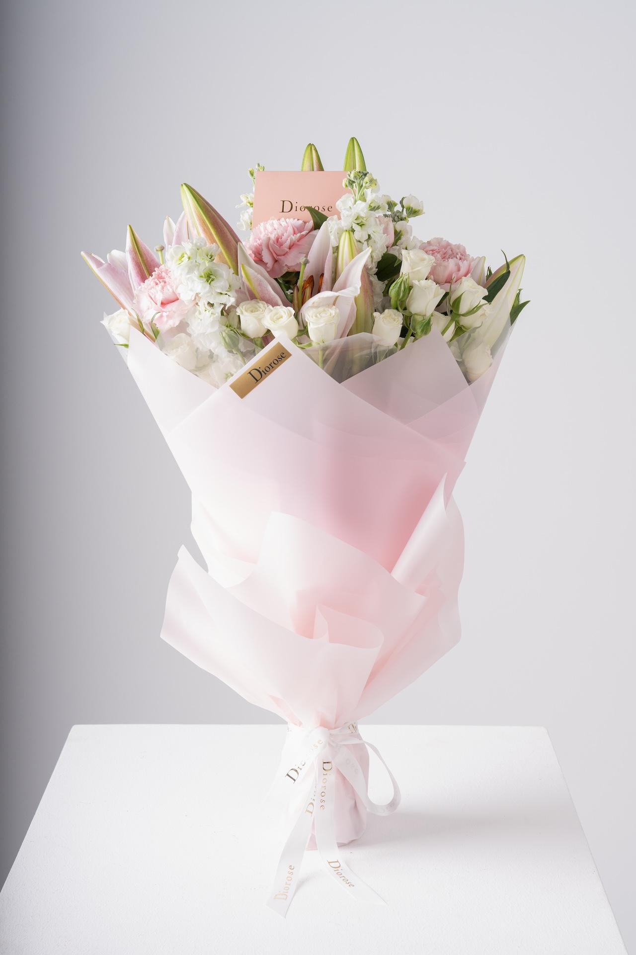 HAND BOUQUETThis beautiful bouquet features lilies, pink carnations, snow white spray roses, and pink matthiola, wrapped in your choice of pink or white wrapping. The soft, delicate blend of pink and white blooms creates an elegant, timeless arrangement that’s perfect for any occasion or as a thoughtful gift.