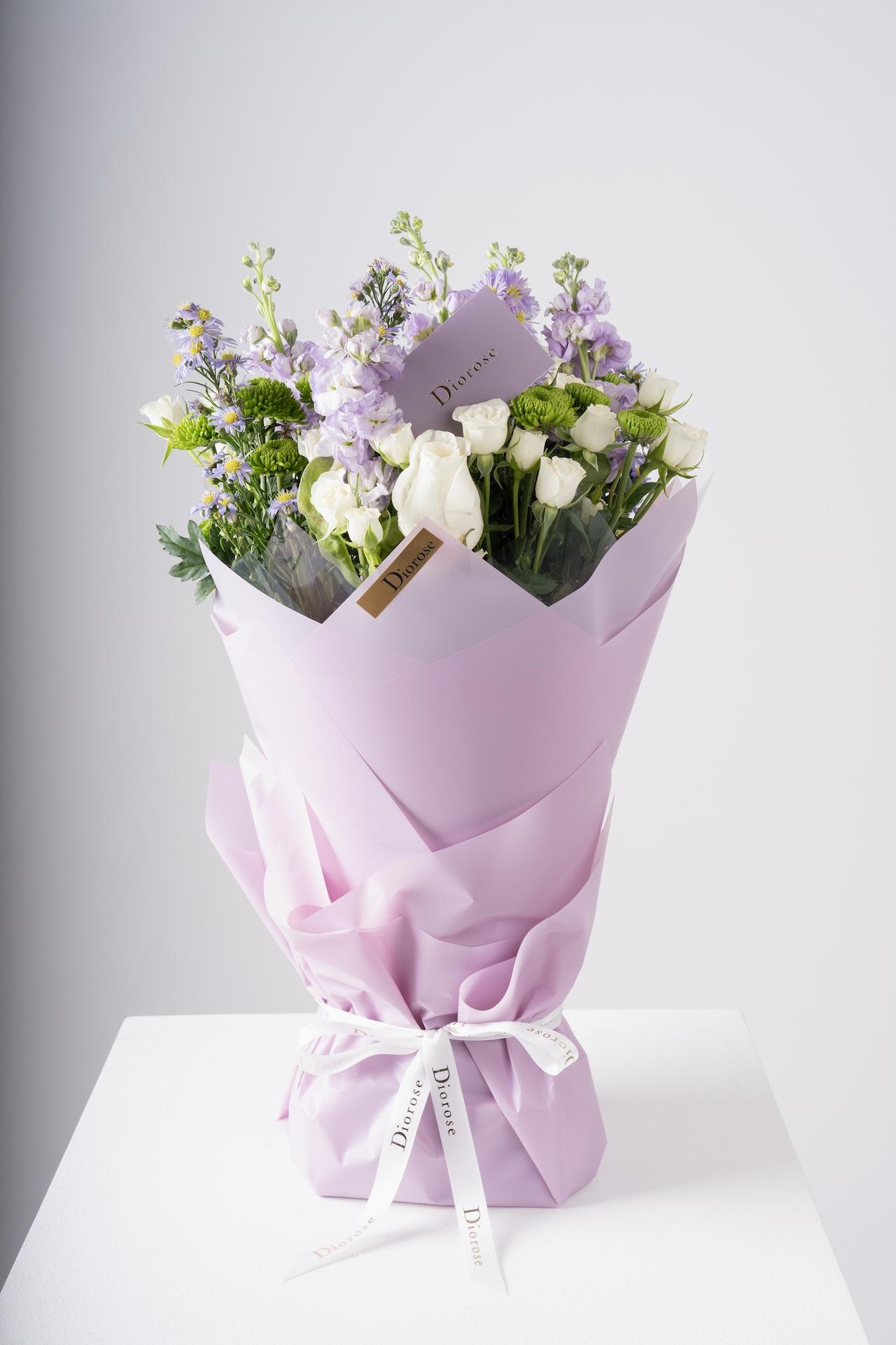 HAND BOUQUETThis stunning hand bouquet features matthiola purple, snow white spray roses, and green chrysanthemums. The rich purple, soft white, and fresh green blooms combine to create a charming and elegant bouquet, perfect for any special occasion or as a thoughtful gift. A beautiful arrangement that adds vibrancy and sophistication to any setting.