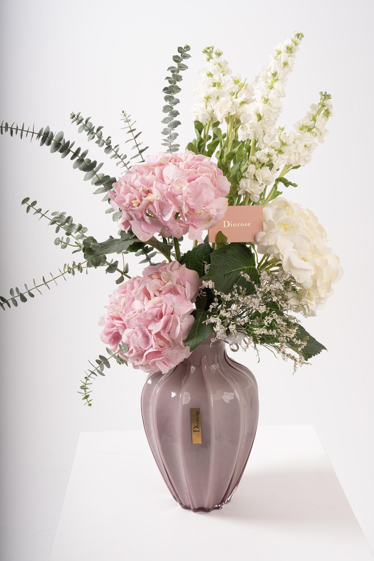 VASESElevate any space with soft luxury and timeless beauty. This elegant arrangement features a blend of light pink and ice white hydrangeas, paired with delicate matthiola, limonium, and fresh eucalyptus, all styled in a luxury pink glass vase that adds a modern, feminine touch.
