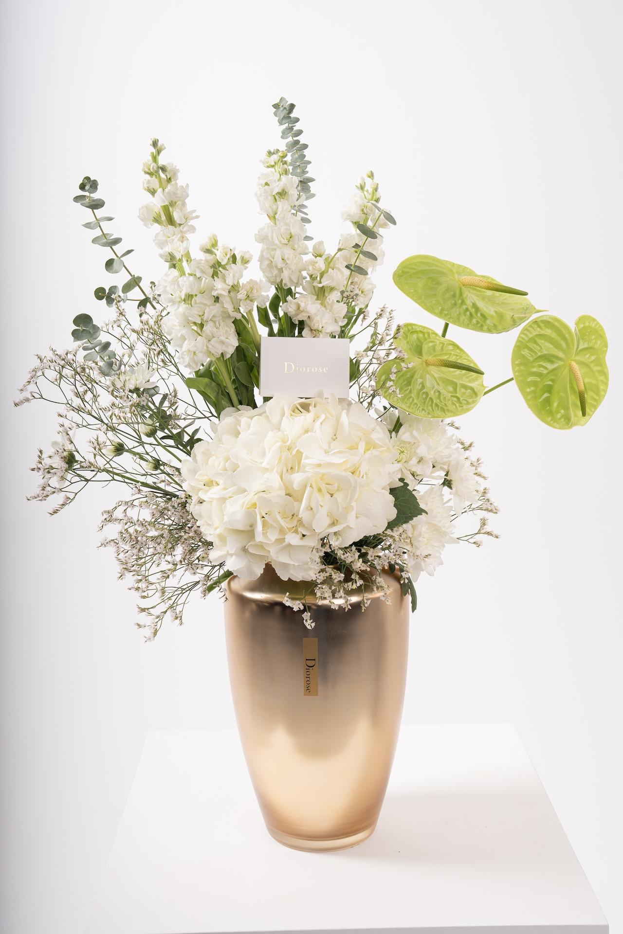 VASESA refined blend of freshness and sophistication. This striking arrangement features ice white hydrangeas, green anthurium, matthiola, white chrysanthemums, and eucalyptus — all beautifully styled in a fancy gold vase that adds a touch of modern luxury.