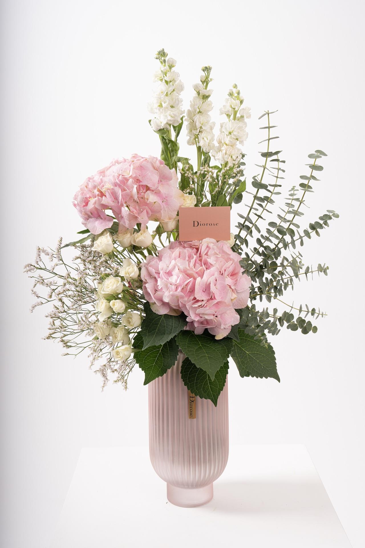 Soft, romantic, and effortlessly elegant — this floral arrangement is a true statement of refined charm. Set in a delicate pink glass vase, it features light pink hydrangeas, matthiola, spray roses, limonium, and eucalyptus for a lush, textured look that feels straight out of a boutique hotel suite.