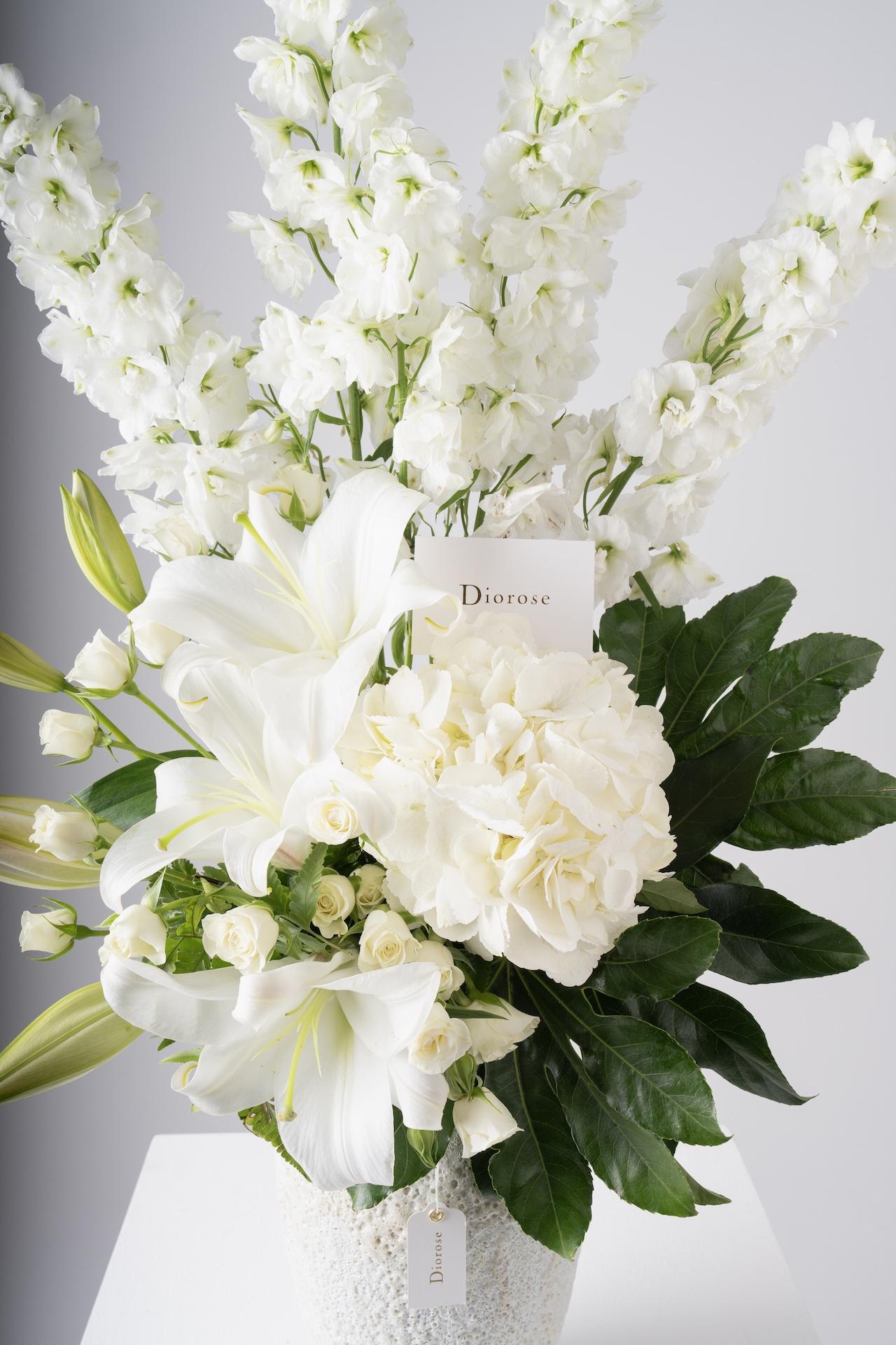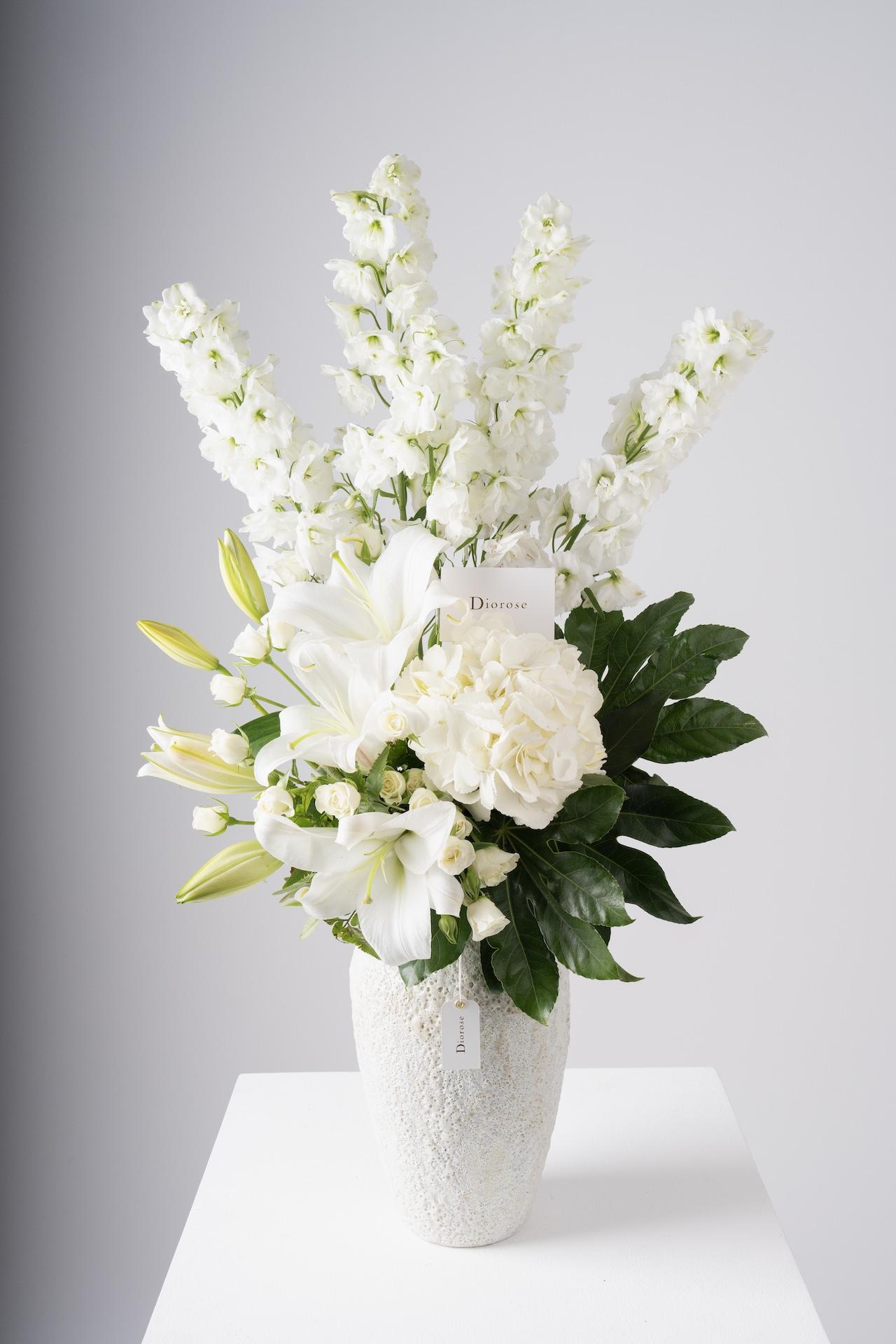 VASESEnhance your space with this exquisite blend of White delphinium, hydrangea, lilies, and white spray roses, beautifully accented with lush green leaves. You can select from a variety of elegant vases to make this the perfect gift or stylish addition to any room.