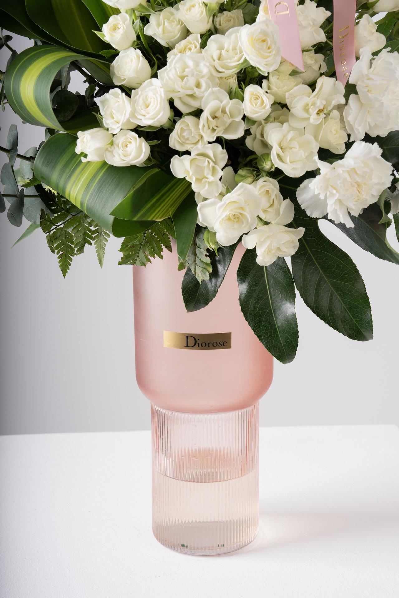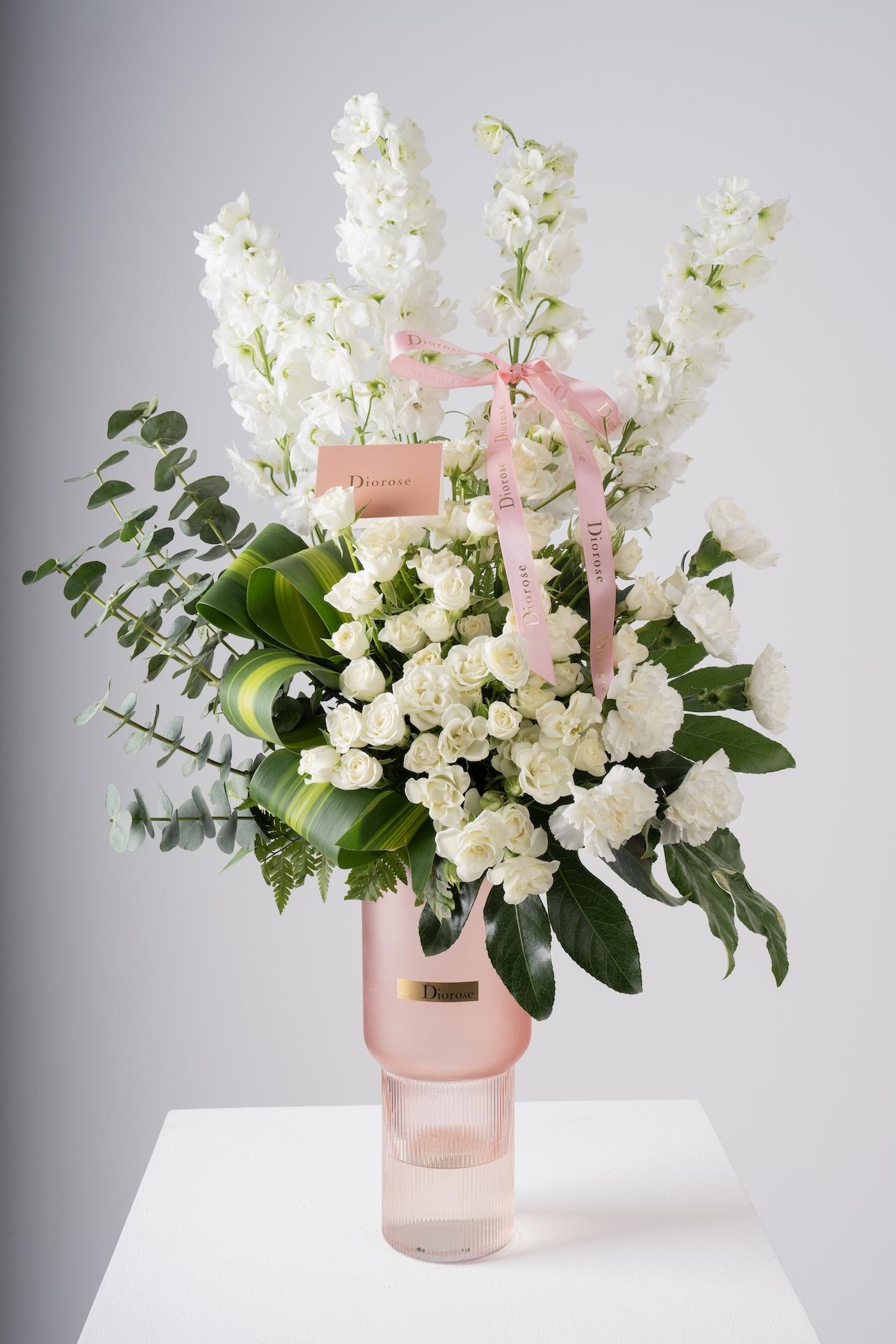 VASESSoft and sophisticated, this arrangement features white delphinium, hydrangea, lilies, and spray roses, styled with fresh greenery and finished with a delicate ribbon for an elegant touch. Presented in a vase of your choice, it’s the perfect gift or a graceful addition to your home décor.