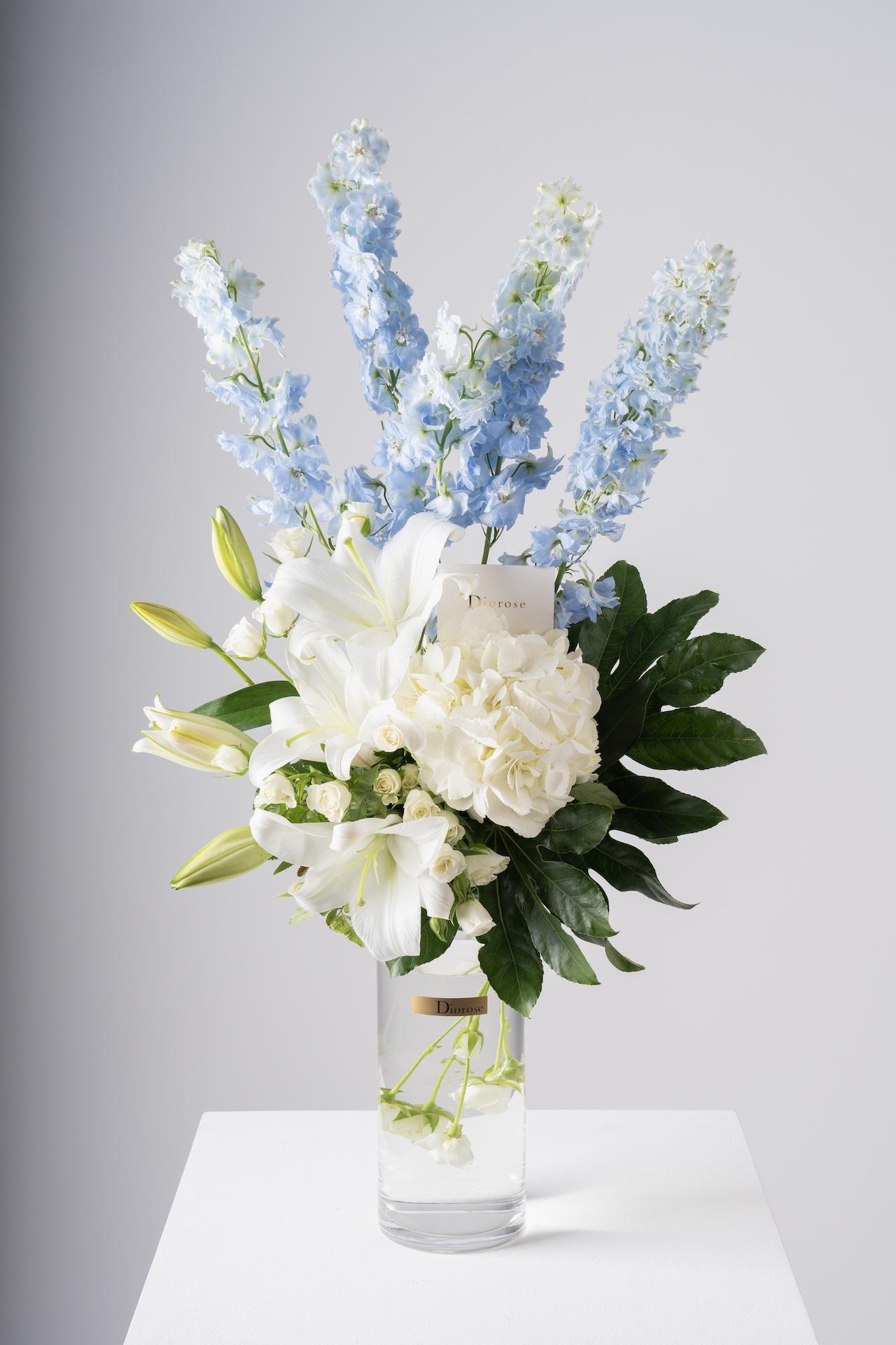 VASESEnhance your space with this exquisite blend of light blue delphinium, hydrangea, lilies, and white spray roses, beautifully accented with lush green leaves. You can select from a variety of elegant vases to make this the perfect gift or stylish addition to any room.