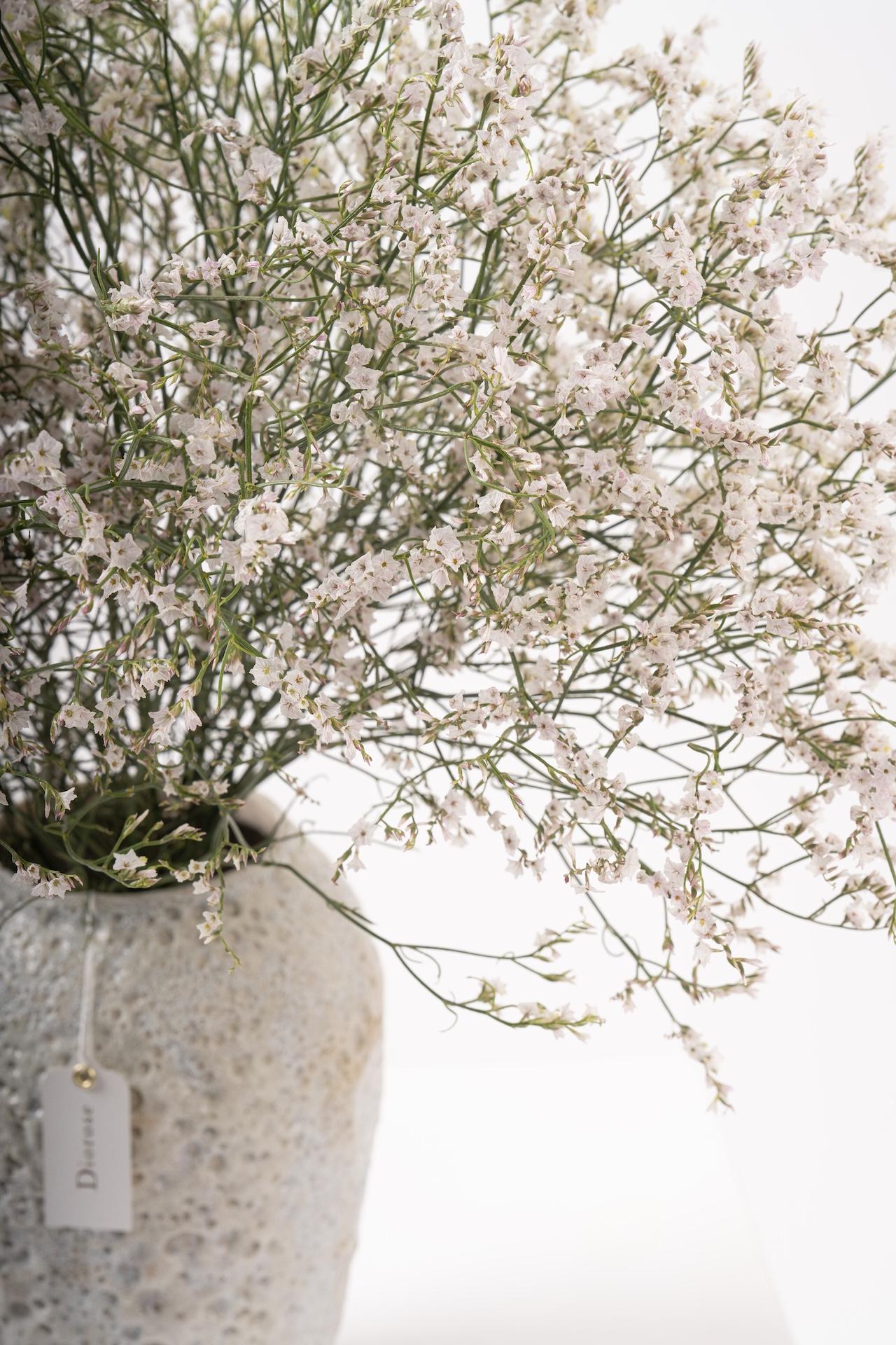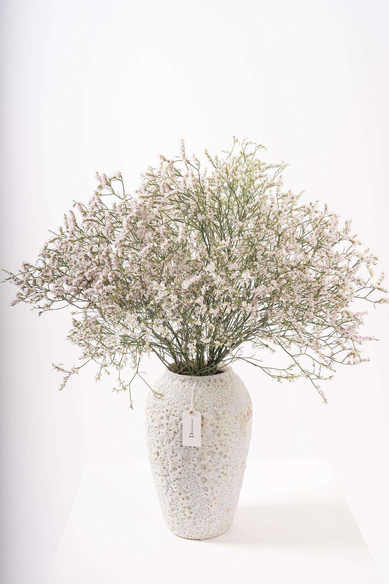 VASESBring a touch of luxury to your space with this elegant arrangement of pink or purple limonium, expertly arranged in a white textured ceramic vase. Its vibrant blooms and sleek design evoke the style of a high-end hotel lobby, adding a chic, contemporary flair to any room. Perfect for elevating your home, office, or as a sophisticated gift that exudes refinement.